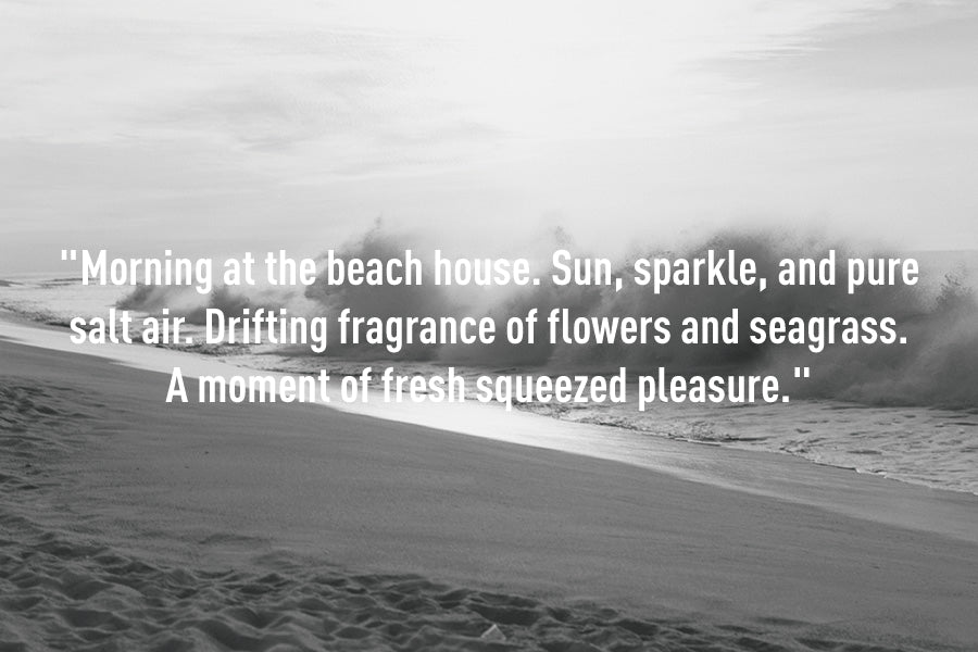 輝く日を浴びながら過ごす朝のビーチハウスでのひととき。澄んだ潮の香り、花々や海藻の香りが漂う心地よい瞬間を表現しました。フレッシュなホワイトグレープフルーツ、マンダリン、柚子がブレンドされたカリフォルニアのビーチをイメージした香りです。