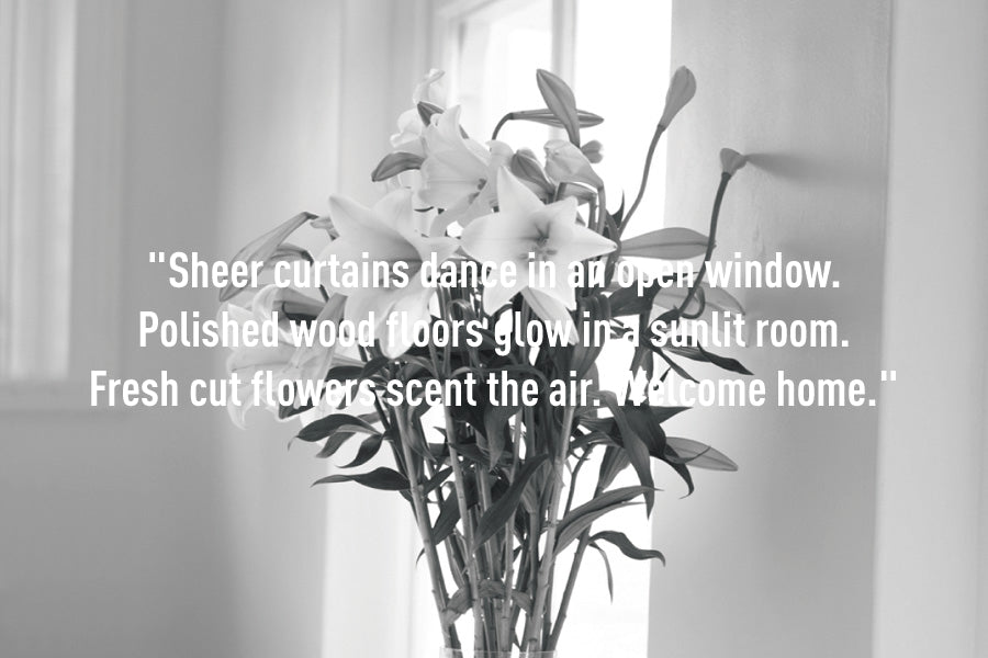 "白く透き通るカーテンが、風にそよいで踊る。陽だまりの部屋では、磨かれた木の床がやさしく輝く。切りたての花々がやわらかな香りを運び、静かに世界がやわらいでいく。ここが、わたしの帰る場所。"